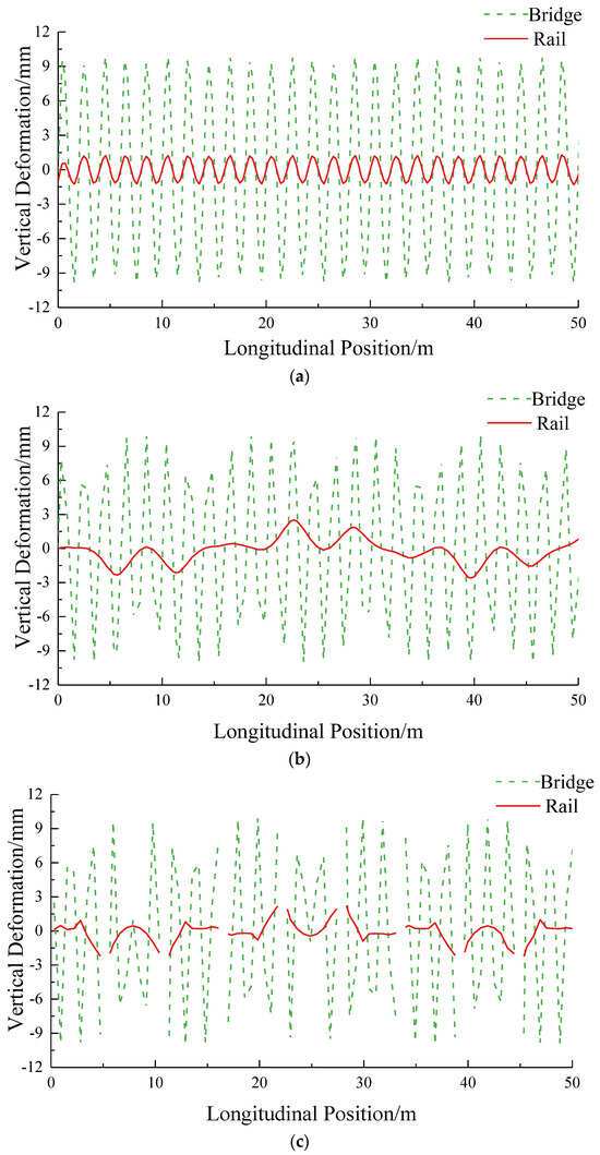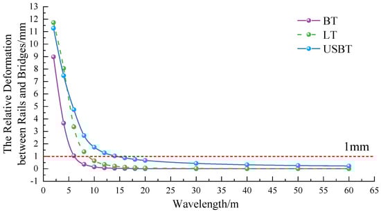 Figure 2 shows the difference between the rail deformation and the bridge deformation of the ballasted track (BT), the longitudinal-connected track (LT), and the unit slab-type ballastless track (USBT) influenced by continuous cosine waves with varying wavelengths. The figure reveals that, when the bridge deformation wavelength exceeds 6 m, 10 m, and 16 m for the BT, the LT, and the USBT, the difference in deformation between the bridge and the track is less than 1 mm. Conversely, for the wavelength of the bridge deformation below 6 m, 10 m, and 16 m, a substantial difference is observed in both track and bridge deformation.