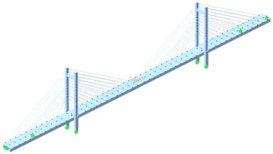 Table 4. Finite element models of cable-stayed bridges are established by the Midas 2022 software. The main beam and bridge tower are modeled by the beam element. The cable is simulated by the truss element. The connection between the main beam and the support is modeled by the rigid arm unit. The support is rigidly connected with the foundation. The model of the long-span, cable-stayed bridge is depicted in