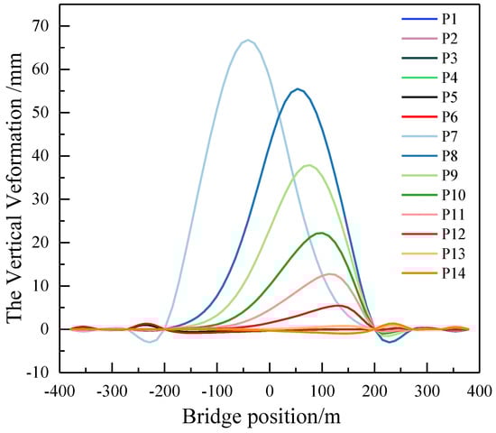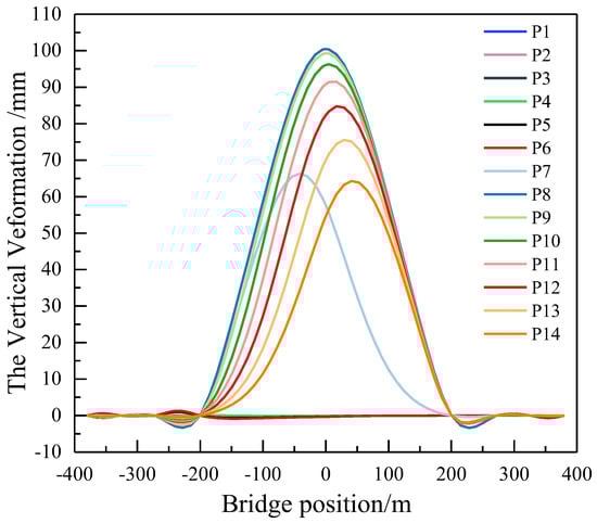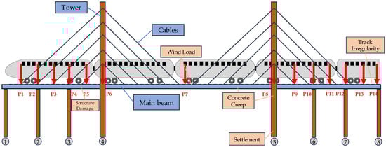 Figure 5, complex loads for long-span, cable-stayed bridges encompass train loads, the temperature, and the pier’s settlement, with the wind load’s effects currently excluded due to its minimal impact on vertical deformation. The vertical deformation and wavelength characteristics of cable-stayed bridges exhibit variations under different train formations. Train loads are considered for 8 cars with a length of 200 m and 16 cars with a length of 400 m. The temperature is factored in the overall lift of 20 °C and 15 °C of the cables. Considering the arrangement of piers, including the side pier’s settlement, the bridge tower’s settlement, the auxiliary pier’s settlement, and the settlement’s combinations, the settlement of piers is set at 5 mm. As an example, a seven-span steel–concrete combined beam cable-stayed bridge with a main span of 400 m is examined to investigate the distribution of vertical deformation under typical loads. P1 to P14 represent the moving load train working conditions corresponding to the first car acting on different positions of the bridge. Number ① to ⑧ represent the pier number.
