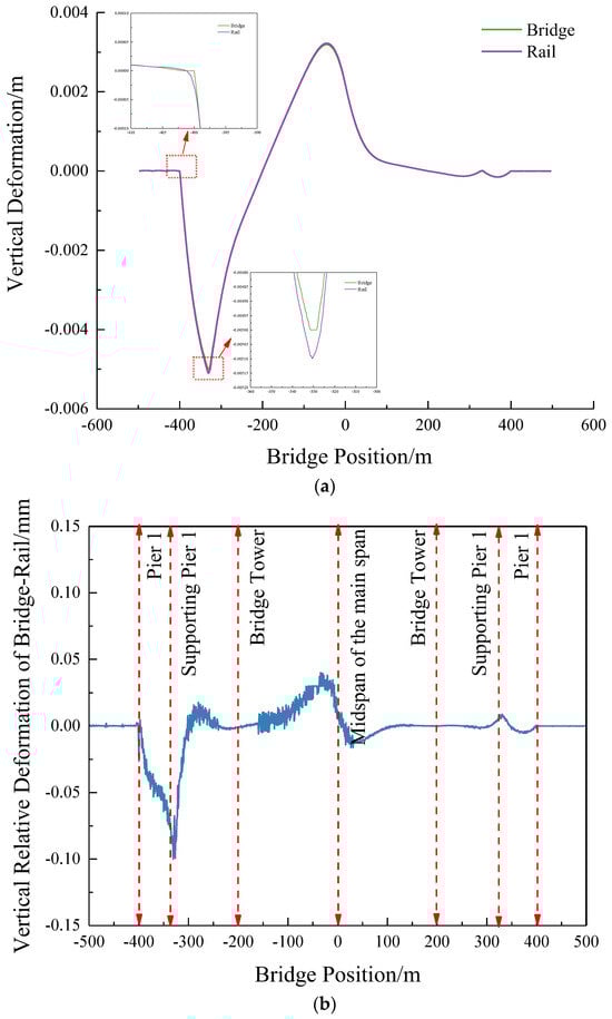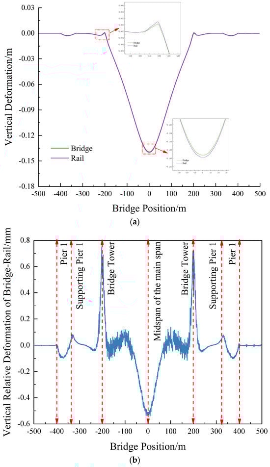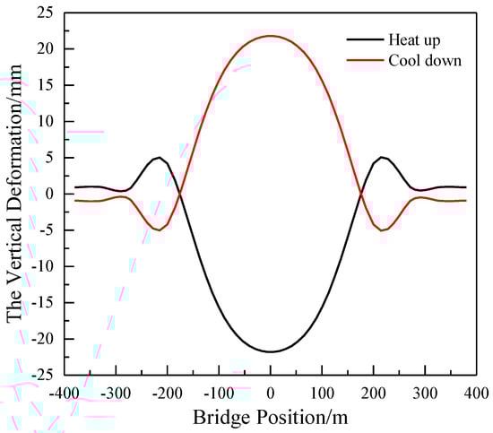 Figure 16 illustrates the mapping relationship of the vertical deformation between the bridge and the track under the condition of a 15 °C warming of the cable-stayed cables.