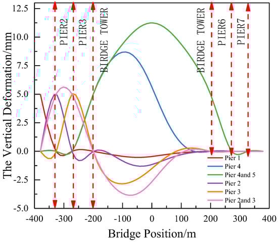Figure 10. When the side span’s piers and auxiliary’s piers settle, the number of anti-bending points in the side span bridge deck increases, resulting in a more pronounced short-wave deformation. Conversely, when settlement occurs uniformly across all components, the overall smoothness of the bridge deck deformation improves.