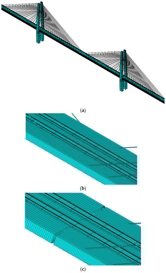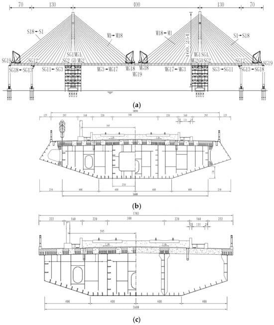 Figure 11, the bridge adopts a semi-floating system and adheres to a span arrangement of (70 + 130 + 400 + 130 + 70) m. The main beam, fashioned from a steel–concrete combination, maintains the 10.5 m length of the standard section. The tower’s design follows the H-type configuration. And the height of the bridge tower is 3.649 times the width of the main beam. Cables adopt a fan-shaped layout, totaling 72 pairs. Engineered for a speed of 350 km/h and featuring a two-lane configuration, the main line spacing is fixed at the 5 m. The bridge integrates a ballastless track structure, laying a seamless line.
