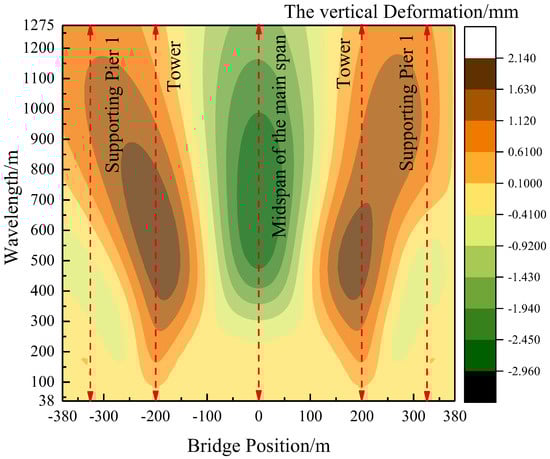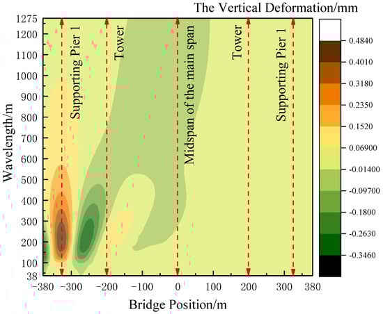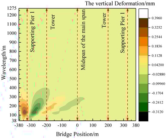 As the train traverses the bridge and the auxiliary pier settles, the vertical deformation of the expansive cable-stayed structure becomes more pronounced within the wavelength range of less than 200 m. Moreover, the temperature differential between the cables and beams significantly impacts the vertical deformation of the main span. Considering these factors, a thorough examination is undertaken to explore the wavelength characteristics of vertical deformation in a long-span, cable-stayed bridge. This investigation focuses specifically on scenarios involving the 5 mm settlement of auxiliary piers and a 15 °C temperature rise in tension cables, particularly during the train’s entry onto the bridge.