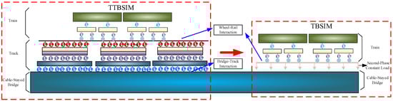 In the train–bridge dynamic coupling simulation model, the consideration of the track structure parametric vibration effects is omitted. Instead, the track structure is simplified and applied to the bridge main beam as a second-phase constant load, as shown in