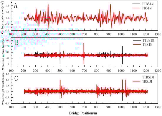 From the figure, it is evident that, when comparing the train vibration response under different excitation conditions, the distribution pattern of the car body vertical acceleration calculated by both the TTBSIM model and the TBSIM model are essentially consistent. Similarly, the distribution patterns of the wheel–rail vertical force and wheel weight reduction rate align closely. Notably, locations with sudden stiffness changes, such as the bridge tower, exhibit higher values for the wheel–rail vertical force and wheel weight reduction rate as obtained from the train–bridge dynamic coupling model.