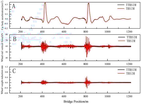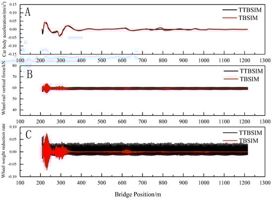 Under the influence of the random irregularity, the temperature-induced deformation of the cable beam, and the settlement of the auxiliary pier, the TTBSIM model and the TBSIM model are utilized to calculate the vertical acceleration of the car body, wheel–rail vertical force, and wheel-weight reduction rate during the entire process of the train entering and exiting the bridge, as illustrated in