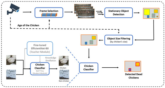 This paper presents a novel automated system for detecting dead chickens using CCTV footage, combining deep learning techniques and knowledge distillation to enhance detection accuracy and efficiency. The system integrates stationary object detection with EfficientNet and DeiT for classification and employs a dynamic frame selection strategy that adjusts the monitoring frequency based on the chickens’ age. The key contributions of this work include the following: