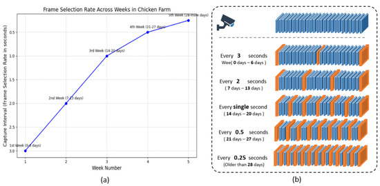 Chart and block diagram showing the frame selection rate across the age of the chicken (a,b). In (b), frames from the CCTV footage are represented in blue and orange colors. The orange color represents the captured frames for evaluation.
