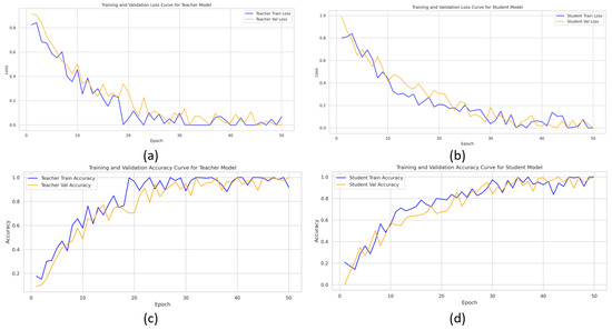 Training and validation loss and accuracy curves: (a,b) are the training and validation loss curves for teacher and student models, respectively. (c,d) are the training and validation accuracy curves for both models.