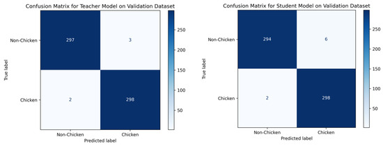 In Figure 4, the loss curves illustrate the decline in training and validation loss over the epochs for both the teacher and student models. This indicates that both models effectively minimize classification errors during training. Similarly, the accuracy curve depicts the improvement in training and validation accuracy, highlighting the models’ ability to correctly classify chickens and non-chickens with high precisions.
