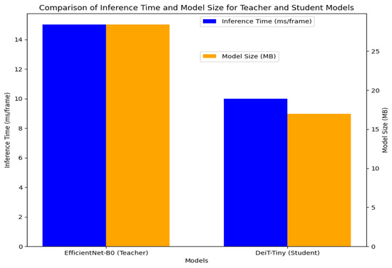 Table 2 summarizes the comparative performance and computational metrics of the EfficientNet-B0 teacher model and the DeiT-Tiny student model. While the teacher model exhibited slightly higher accuracy, the student model achieved nearly comparable performance with a notable reduction in inference time and model size. Figure 6 visually represents these efficiency gains, emphasizing the student model’s suitability for real-time deployment in resource-constrained environments like chicken farms.