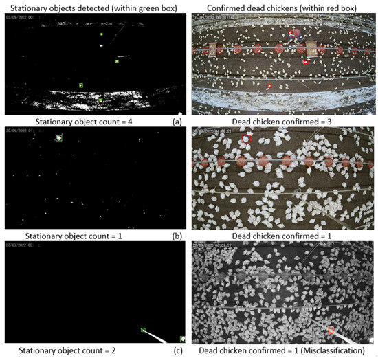 Examples of correct detections in (a,b) and common failure cases in (c). The first column contains the images of stationary object detection (within green box), and the second column contains the images of the confirmed dead chickens (within red box).