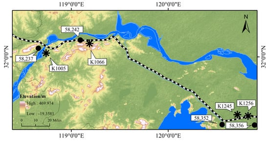 The wind speed sensor used to monitor wind speeds affecting the HSR utilizes an ultrasonic anemometer with a measurement accuracy of 0.1 m/s and a frequency of 100 Hz, with data recorded every second. The sensor and associated equipment are mounted on 4 m high pillars located 1 m from the track, in accordance with railway department requirements. This analysis focuses on four representative HSR stations: Dashengguan Station (K1005), Jurong Zouwang Road Station (K1066), Yangcheng West Lake Station (K1245), and Yangcheng Lake West Bridge Station (K1256). K1005 is centrally located on the Dashengguan HSR bridge over the lower Yangtze River, where the wind speed on the bridge deck is often higher than on surrounding land, posing a risk to high-speed trains during high winds. The maximum recorded wind speed over the past three years reached 30 m/s. K1066, situated in the Baohua Mountain area, features a low track bordered by high sides, creating a valley effect that accelerates wind through the area. Both K1245 and K1256 are positioned along the Yangcheng Lake section of the Beijing–Shanghai HSR; however, K1245 is situated over the lake, while K1256 is located on the shore. Wind speed data for these stations span the entire year of 2020. The exact locations of the four HSR stations are shown in Figure 1.