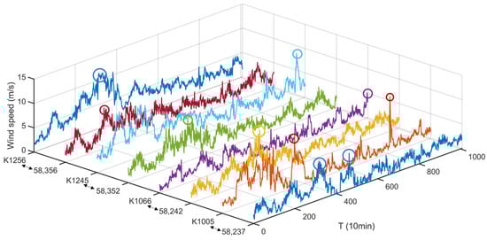An HSR frequently traverses challenging landscapes, including bridges and canyon passes. According to the Code for Design of High-Speed Railways (Code TB 10621-2014), wind speed and direction monitoring points should be installed on HSR sections with a design speed of 300 km/h or higher where the maximum wind speed has exceeded 15 m/s in the past 20 years. Similarly, monitoring points should be installed on railway sections with a design speed of 250 km/h or higher where the maximum wind speed has exceeded 20 m/s during the same period. As a result, unlike terrestrial WSs, the monitoring of wind speed at RSs is regionally complicated and strong winds are typical [33,34]. According to Figure 2, from an average wind speed of 10 min, the WS wind speed is comparatively constant, while the RS wind speed is typically excessively high with many peaks. The circled wind speed peaks in the figure indicate that the wind speed of RSs is higher than that of WSs and exhibits greater non-stationarity. The wind speed acquisition equipment will also record the wind speed being observed at the HSR station due to the wind being generated by the train passing by, while the ground WS monitors the natural wind speed and direction.