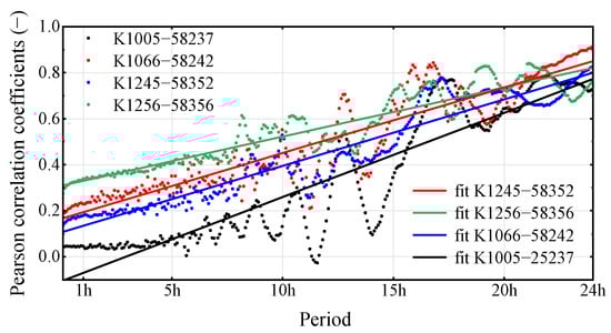 The high-resolution wind speed of HSR is mapped to the time scale of WSs while considering the various monitoring intervals of wind speed at RSs and WSs. To acquire the correlation of wind speed in the same time period, we created four groups of RSs and WSs, namely, K1005-58237, K1066-58242, K1245-58352, and K1256-58356. For quantitative characterization, the Pearson correlation coefficient was utilized. The correlation coefficients for the four groups of wind speeds from 5 min to 24 h are displayed in Figure 3. Each group’s linear fitting is represented by a straight line, and the goodness of fit is shown by . Overall, as the interval sampling time is increased, the connection between WS and RS grows. The best correlation was found for K1256-58356. Due in large part to the K1005 station’s location on a bridge 50 m above the ground, K1005-58237 exhibits the poorest correlation. The correlation between the locations is modest, all lower than 0.4, for the time period below 6 h. The association between the wind speed at the RS and the WS dramatically increased across the time range of 6 h to 24 h, displaying a fluctuating increase. The connection between RS and WS can approach 0.7 when the wind speed time scale is extended to 24 h.