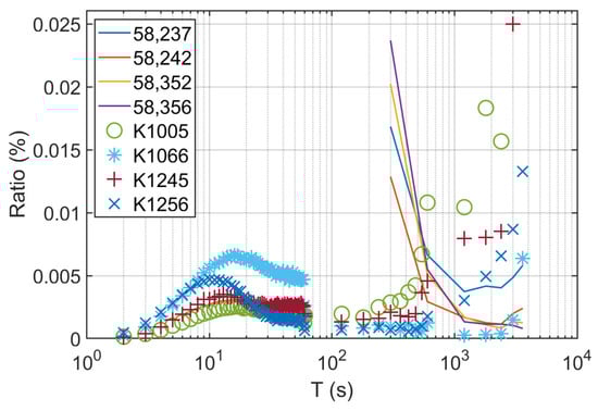 The of the four RSs’ wind speed and the WSs’ wind speed are depicted in Figure 4. The of RS and WS are and , respectively. of RS displayed an increase–decrease–increase pattern. When the time scale is less than 102 s, the amplitude of the pulsating wind speed of K1066 is the highest, and the HSR station reaches its apex at the 101 s scale. When the time scale is more than 102 s, the RS gradually grows until it reaches its maximum at the 60 min scale, with K1005 being the most noticeable. The WS , unlike the RS , achieves its peak at the 5 min time scale and exhibits a rebound tendency at the 30 min and 60 min time scales. In general, RSs and WSs function differently in terms of fluctuations. While WSs see the greatest swings during the shortest time periods, wind speed fluctuations at high-speed train stations steadily rise on a minute scale. Therefore, it is advised to anticipate of high-speed rail wind speed using a time scale of 102 s to 5 min.