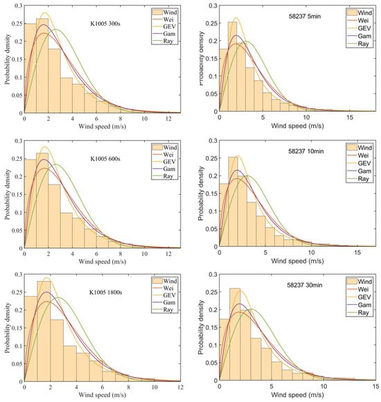 The probability distributions and histograms of the wind speed at stations K1005 and 58,237 at various time scales in February are shown in Figure 5. The distribution of wind speed at various time intervals can be essentially characterized by a distribution function, which has nothing to do with the wind speed’s time scale. The statistical inaccuracy of the HSR station K1005 PDFs for February is shown in Appendix A. Wei’s statistical error results are the best when compared to those of other distribution functions, suggesting that Wei can model the wind speed of K1005 at various time intervals. Wei, meanwhile, has proven to be a generally accepted model for wind speed modeling [38].