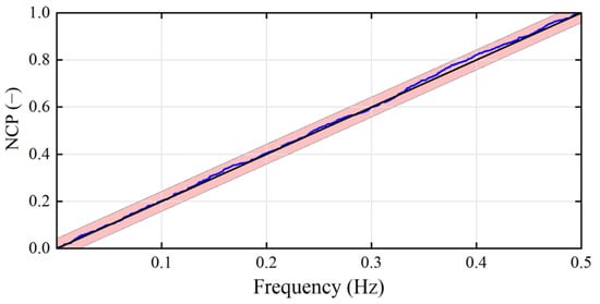 is the NCP at frequency , is the kt-h frequency, and . Bartlett’s test statistic is defined as the deviation of from the NCP straight line. The null hypothesis of white noise is rejected if the p-value calculated from Bartlett’s test statistic B is less than the specified significance level .