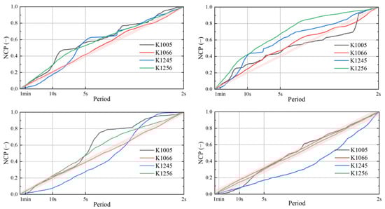 Figure 8 illustrates the predictability of HSR wind speed over four time scales: 1 h, 3 h, 6 h, and 12 h intervals. For clarity, the x-axis of the normalized cumulative period (NCP) plot has been replaced by the sampling period instead of the typical sample frequency. During the 1 h monitoring period, only the wind speed at station K1245 is predictable, as indicated by its blue line being outside the confidence interval, while the other three lines remain within it. In the 3 h and 6 h monitoring periods, the red line falls inside the confidence interval, while the other three lines are outside, showing that wind speed at station K1066 is unpredictable at these times. Notably, random walks are inherently unpredictable, and the unpredictability here refers to the sequence’s behavior. In the 12 h detection period, all four line segments fall outside the confidence interval, indicating that wind speeds at the four stations can be predicted regardless of the sampling interval.