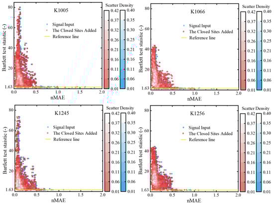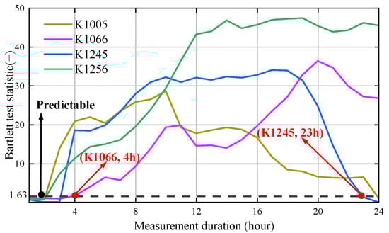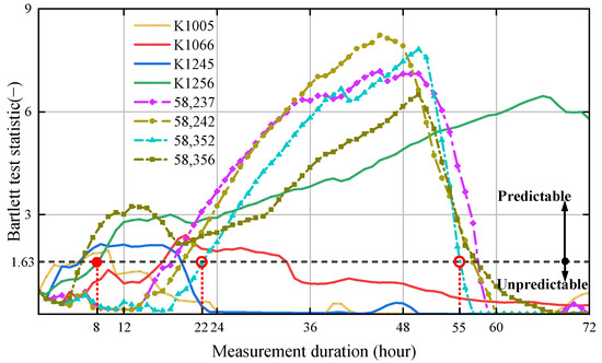 The characteristics of historical wind speed data provide an indication of the predictability of wind speed at any given moment. The reference criterion (1.63, at a significance level of 0.01) and Bartlett’s test statistic were compared. If the test statistic exceeded 1.63, the wind speed was deemed predictable. Conversely, if the p-value surpassed the significance level of 0.01 (denoted in red), the wind speed was considered unpredictable, indicating a 1% chance of erroneously concluding a difference from white noise in the absence of white noise. This criterion allows for the assessment of historical wind speed. Wind speed becomes unpredictable when insufficient historical data are available. As the quantity of historical data increases, Bartlett’s test statistic rises, indicating greater predictability of wind speed. As shown in Figure 9, the four RS wind speeds initially exhibited unpredictability (sampling frequency = 1 s, implying a 1 s interval between wind speed series), but as the number of historical data points increased, the statistical properties steadily improved. However, this trend does not continue indefinitely; an excess of historical data can degrade the statistical properties. For example, K1005 and K1245 lose their predictive capability when provided with 45 and 47 h of historical data, respectively. The maximum duration of historical data that can be predicted is 37 h (45 h–8 h).