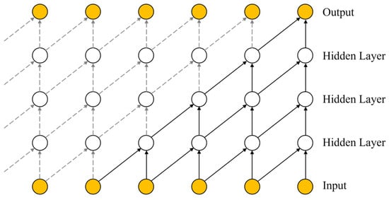Temporal convolutional network (TCN) is a model architecture developed based on convolutional neural networks (CNNs). The TCN model incorporates causal convolution, which ensures the temporal order of the input sequence, and dilated convolution, which expands the receptive field. Additionally, the residual connection block enhances the model’s prediction accuracy. To mitigate overfitting, dropout is integrated into the model. The TCN architecture consists of causal convolution, dilated convolution, and residual connections, as illustrated in Figure 13.