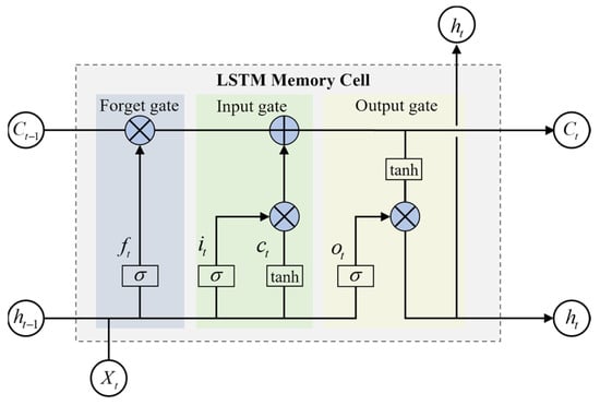 Where is the input at time , is the hidden layer output at time , is the memory unit at time , is the temporary memory unit, represents element-by-element multiplication, represents element-by-element addition, the forget gate determines the information added to the current memory unit , and the output gate controls the output result of the memory unit . The calculation process is as follows: