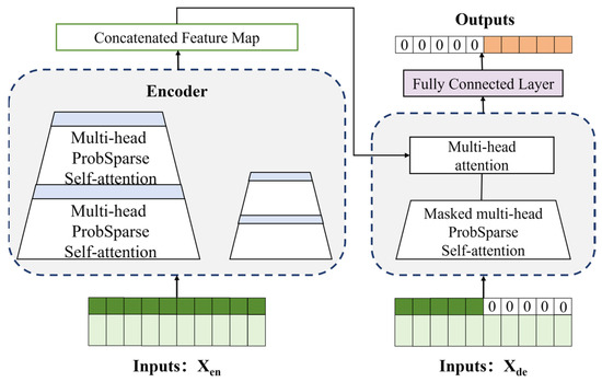 The informer model is a self-attention-based architecture derived from the transformer model. By enhancing its structure, the informer improves the processing of long time series data. A key feature of the model is the introduction of the ProbSparse attention mechanism, which enables high performance with reduced complexity, addressing the limitations of the traditional transformer model. The model structure is shown in Figure 15, with the left side representing the encoding process and the right side the decoding process. The encoder extracts feature from the input sequence using a multilayer, multi-head probabilistic sparse self-attention mechanism. The decoder receives the sequence input (with the prediction sequence set to zero), interacts with the encoded features via the multi-head attention mechanism, and outputs the wind speed prediction result.