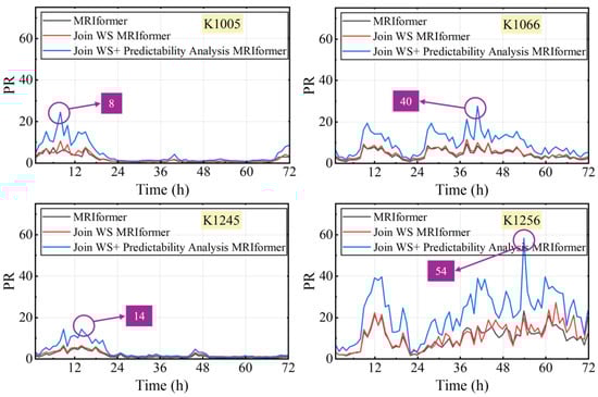We further investigated the impact of wind speed predictability on forecasting outcomes. The wind speed in February was predicted for each station using different methods. Initially, the Bartlett test was employed to assess the predictability of wind speed. Subsequently, the widely used models—TCN [41], LSTM [42], informer [43], and MRIformer [44]—were applied to predict the 5 min average wind speed at four high-speed rail stations. While good prediction results can already be achieved using the historical wind speed data from a single station, incorporating spatial wind speed information from multiple stations enhances the accuracy of the predictions [45]. To evaluate this, we introduced a control group that used wind speed data from the nearest WS station as an auxiliary feature input to the forecast model. The wind speed prediction process for this part is illustrated in Figure 12. The wind speed prediction is represented by the following formula: