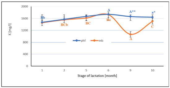 Potassium content in milk of phf and mb cows at different months of lactation. A, B, C—p ≤ 0.01; a, b—p ≤ 0.05—differences between months within the breed. **—p ≤ 0.01; *—p ≤ 0.05—differences between breeds within the month. phf—Polish Holstein-Friesian breed, mb—Montbéliarde breed.