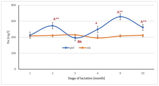 Sodium content in milk of phf and mb cows at different months of lactation. A, B—p ≤ 0.01; a, b—p ≤ 0.05—differences between months within the breed. **—p ≤ 0.01—differences between breeds within the month. phf—Polish Holstein-Friesian breed, mb—Montbéliarde breed.