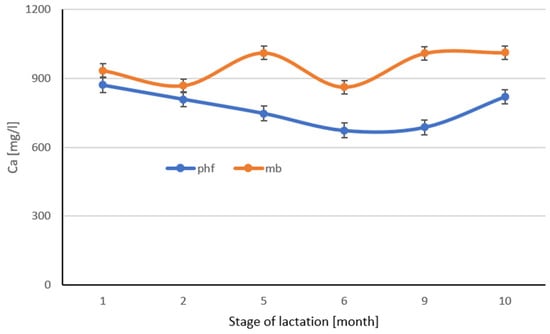 Calcium content in milk of phf and mb cows at different months of lactation. phf—Polish Holstein-Friesian breed, mb—Montbéliarde breed.
