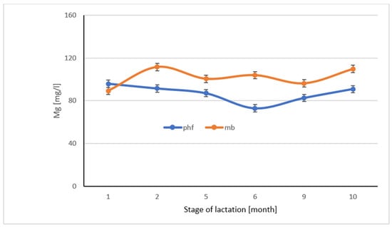 Magnesium content in milk of phf and mb cows at different months of lactation. phf—Polish Holstein-Friesian breed, mb—Montbéliarde breed.