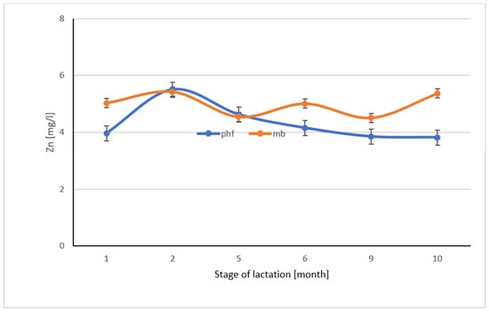 Zinc content in milk of phf and mb cows at different months of lactation. phf—Polish Holstein-Friesian breed, mb—Montbéliarde breed.