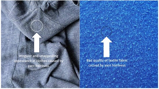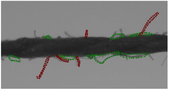 As the quality and performance of textile products depend on the yarn quality used in their production [2], companies face challenges related to the origin and quality of raw materials. The absence of effective systems for analyzing and controlling yarn quality can lead to significant losses, resulting in customer complaints and financial setbacks. One main issue with yarn is hairiness [3,4,5], which refers to short, fine fibers released from the yarn surface. These fibers can originate from loose fibers not properly incorporated, fibers that broke during processing, or low-quality fibers. Various types of hairiness (Figure 1) can be found in yarns, including protruding and loop fibers. The short fibers that protrude from the yarn surface, due to low-quality fibers or breakage during processing, are called protruding fibers.