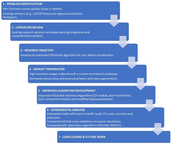 Below is a diagram, in Figure 3, that presents the main stages of the development of the research described in this article. The diagram ranges from the identification of the hairiness problem in textile yarns and the limitations of existing solutions, through the literature review and definition of the objectives, to the practical steps of preparing the data set, developing the optimized YOLOv5s6 algorithm, a detailed experimental analysis, and, finally, the conclusions and proposals for future work.