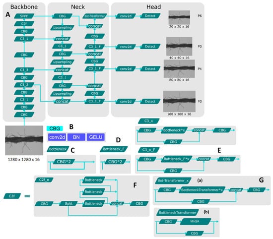 Network structure for YOLOv5s6 ((A): The complete structure with backbone, neck, and head modules. (B,C): Two unique variations of CSP blocks (C3); (D): CBS—Convolutional Batch Normalization layer and SILU activation function; (E): Other blocks with CBS; (F)—Two distinct bottleneck blocks) [45,46,47].