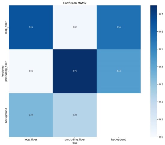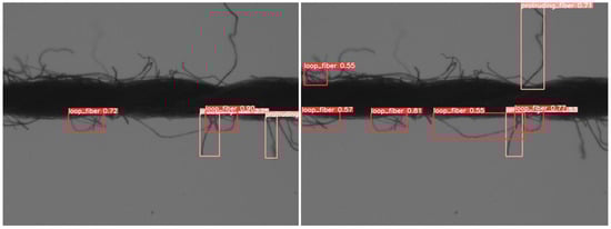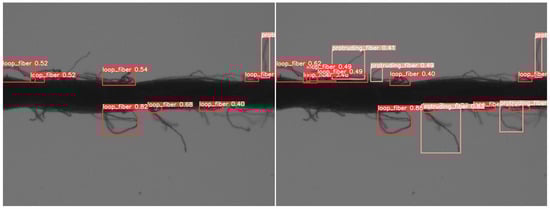 These results are very promising and demonstrate a good performance. In summary, the proposed optimized method showed better object detection accuracy than the original YOLOv5, making it a more efficient and high-performing neural network for the detection of yarn hairiness. The enhanced YOLOv5s6-Yarn Hairiness structure exhibited a good performance in the detection of protruding fibers and, most importantly, showed a very good performance in the detection of loop fibers, which is a highly complex class due to its irregularity and spatial distribution. The complexity of loop fiber detection arises from several critical factors. First, their irregular shape, defined by loop-like structures with varying sizes and orientations, poses significant challenges for consistent detection. Second, their unpredictable arrangement along the surface of the yarn core adds another layer of difficulty. This non-uniform arrangement affects both loop fibers and protruding fibers, as their positioning on the yarn surface can obscure their visibility in images. Finally, loop fibers often blend into the yarn structure, overlapping and intertwining with other fibers, including protruding fibers, further complicating their detection.