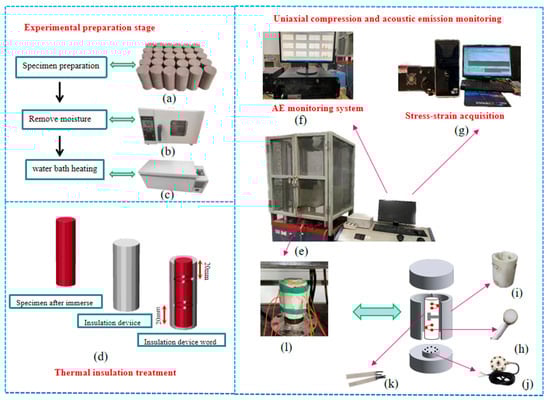 Test flow chart. (a) Sandstone specimen. (b) Electric heating constant temperature drying oven. (c) Warm water tank. (d) Nano 30 sensor arrangement. (e) WAW-1000B electro-hydraulic servo universal testing machine. (f) AE win Express8 acoustic emission system. (g) Donghua DH3820 stress–strain acquisition system. (h) Nano sensor. (i) Insulation device. (j) Radial stress sensor. (k) Strain gauge. (l) Sandstone in the experiment.