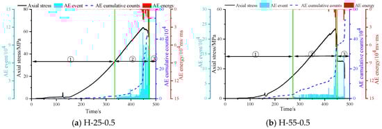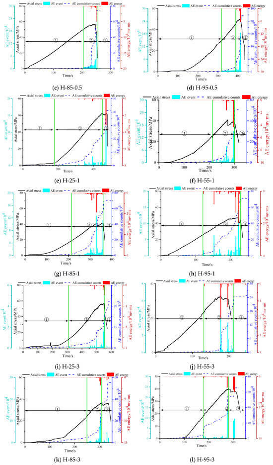 During the fracture and failure process of sandstone, the development and propagation of internal cracks are often accompanied by the generation and transfer of energy. Acoustic emission (AE) can be used to monitor the internal damage of rocks [,]. The AE counts and cumulative counts reflect the extent of crack development and cumulative damage during rock rupture, while the AE energy indicates the amount of energy released during the failure of the sandstone. The acoustic emission signals obtained from the uniaxial compression tests of sandstone under different temperatures and soaking durations are illustrated in Figure 4.
