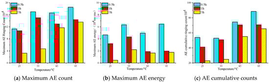 To present the influence of different temperatures and soaking times on the acoustic emission (AE) damage characteristics of sandstone in a more intuitive and clear manner, we conducted a more detailed quantitative analysis of the maximum AE ring count, energy, and cumulative AE ring count of sandstone under various temperatures and soaking times. The results of this analysis are shown in Figure 5.