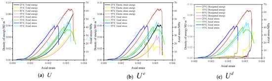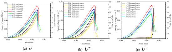 where is the initial modulus of elasticity, and is the value of stress and strain at any point on the stress–strain curve. Based on the above analysis, it is evident that the energies involved in the uniaxial compression process are influenced by the stress, strain, and elastic modulus of the rock. Next, we will analyze the evolution of energy in sandstone under different soaking times and temperatures.