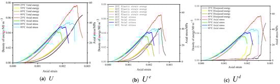 The process of uniaxial compression-induced rock failure is associated with energy input, accumulation, dissipation, and release []. Phenomena such as brittle failure or plastic deformation in rocks represent macroscopic manifestations of the rapid or gradual release of energy. Therefore, from an energy perspective, the influence of temperature and water content (characterized by soaking time) on rock damage and failure can be analyzed more effectively. In the experiment, assuming that the energy input is entirely utilized for internal work or storage, a portion of the energy will be stored as elastic potential energy or dissipated as internal cracks develop. According to the first law of thermodynamics (the law of energy conservation), energy remains constant during its transformation and transfer [].