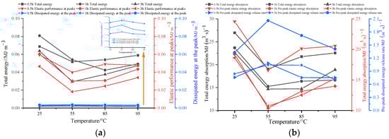 In order to more intuitively illustrate the influence of different temperatures and soaking times on the energy variation in sandstone, the total energy, elastic potential energy at peak stress, dissipated energy at peak stress, energy absorption rate, elastic potential energy absorption rate at peak stress, and dissipated energy release rate at peak stress are summarized in Figure 9.