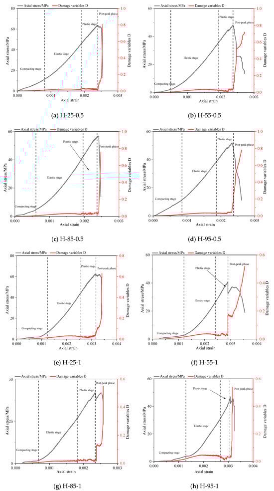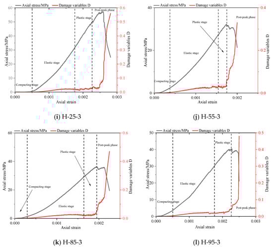 From Figure 10, it can be observed that under 0.5 h soaking, the maximum damage variable values at each temperature are 0.81, 0.72, 0.76, and 0.78, respectively. Under 1 h soaking, the maximum damage variable values at each temperature are 0.63, 0.52, 0.55, and 0.54, respectively. Under 3 h soaking, the maximum damage variable values at each temperature are 0.56, 0.33, 0.47, and 0.48. These data indicate that as the soaking time increases, the maximum damage variable value decreases gradually at the same temperature. This phenomenon occurs because under 0.5 h soaking, the sandstone has a lower water content and undergoes brittle failure, resulting in a larger damage variable. As the soaking time increases, the water content of the sandstone increases, and its ductility improves, resulting in a decrease in the maximum damage value. At the same soaking time, as the temperature increases, the maximum damage variable value initially decreases and then increases, with the smallest maximum damage variable value occurring at 55 °C. This is attributed to the fact that at 55 °C, the sandstone possesses the highest water content, resulting in the minimum damage variable value at this temperature.