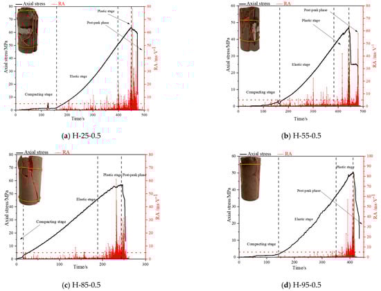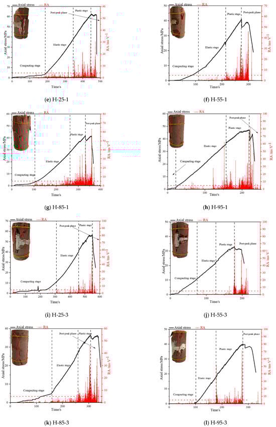 In the previous sections, the damage evolution process of sandstone under different soaking times and temperature conditions has been analyzed. To further investigate the failure characteristics and the final failure type of sandstone, based on the acoustic emission (AE) RA evolution characteristics, the failure modes of sandstone specimens under different soaking times and temperature conditions are examined. The ratio of the rise time to amplitude, denoted as RA, can be used to characterize the development of cracks and failure in rocks. High RA values indicate tensile failure in sandstone, while low RA values correspond to shear failure []. In this study, a threshold of 5 ms·V−1 is defined for high and low RA values []. The time–stress–RA values and the failure types of specimens under different temperatures are illustrated in Figure 11.