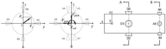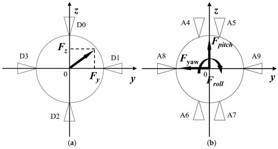 As shown in Figure 1, the four divert thrust nozzles are arranged at the spacecraft’s center of mass, generating thrust in the y-axis and z-axis directions. Additionally, six attitude thrust nozzles are positioned at a certain distance from the center of mass, providing pitch, yaw, and roll control along the three axes.