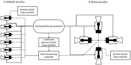 The control system model is depicted in Figure 3. The gas generator primarily produces the working medium required for thrust. The hot gas can be expelled simultaneously through four divert thrust nozzles and six attitude thrust nozzles. The pressure controller regulates the gas generator’s pressure and provides the total opening command for the nozzles. The thrust controller allocates the opening of different nozzles and, within the constraints of the total nozzle opening, generates the required five-axis thrust. The opening controller drives the motor to rotate according to each valve’s opening instructions, completing the closed loop of the nozzle operation. Through the coordinated hierarchical work of the three controllers, the switching of the engine’s operating modes and the output of thrust are achieved.