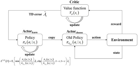 The chooses the action based on the st and receives a reward. The evaluates state values Vt and outputs the TD error. During updates, is backpropagated and clipped within the range of (1 − ε, 1 + ε) to refine both the Critic and Actorlearn networks. Periodically, the Actorlearn parameters are copied to Actorchoose for better action selection.