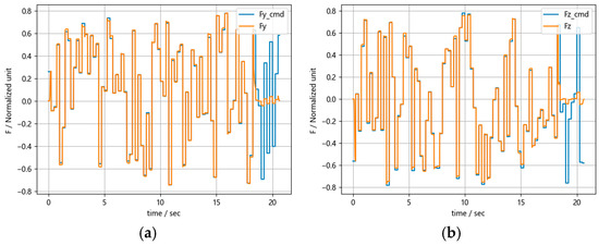 In order to further verify the performance of the reinforcement learning algorithm model proposed in this paper, we built a semi-physical platform. In the semi-physical platform, real valves are used to execute the instructions given by the algorithm, and the engine pressure and thrust are calculated by the fine dynamics model. In order to increase the persuasiveness of the experimental results, we use complex mixed signals to test the algorithm model. The test results are listed in Figure 13, which shows the tracking effect of Fy, Fz, Fpitch, Fyaw, and Froll on the given signal under complex mixed signals. It can be seen intuitively that the algorithm model proposed in this paper has achieved a good tracking effect.