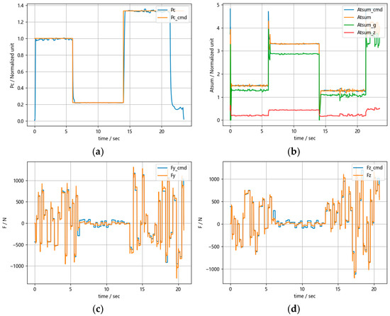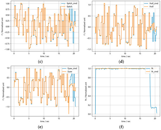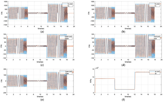 Test results of semi-physical simulation experiment: (a) y-axis thrust, (b) z-axis thrust, (c) pitch-axis thrust, (d) roll-axis thrust, (e) yaw-axis thrust, and (f) pressure.